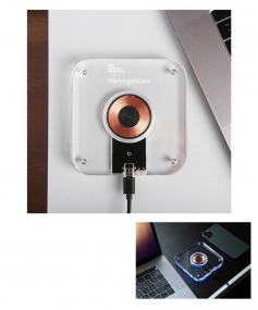 The LoFi wireless charger is a device where functionality meets aesthetics. This sleek acrylic clear charger seamlessly blends into your desktop or workstation, providing a stylish & efficient way to power up your devices. With the press of a button, you can cycle through multiple color options & turn the light off completely. Laser engraved logo glows with backlit colors giving this charger an out-of-this-world branding opportunity. Complies with Prop 65. 4.32" W x 4.32" L x 3" H